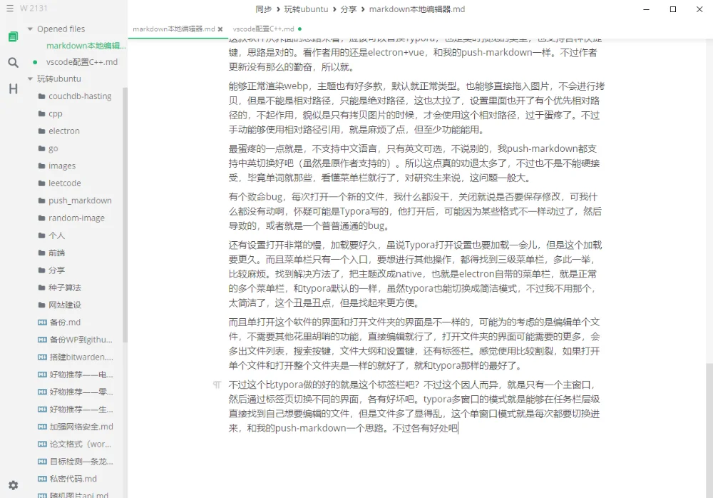 不过这个比typora做的好的就是这个标签栏吧?不过这个因人而异,就是只有一个主窗口,然后通过标签页切换不同的界面,各有好坏吧。typora多窗口的模式就是能够在任务栏层级直接找到自己想要编辑的文件,但是文件多了显得乱,这个单窗口模式就是每次都要切换进来,和我的push-markdown一个思路。不过各有好处吧。