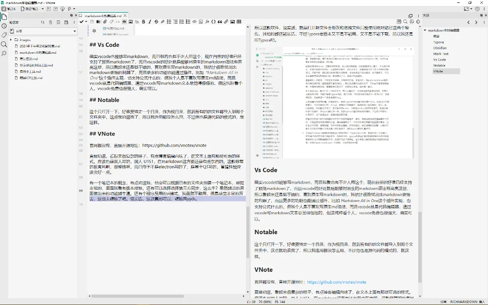 当然,不喜欢所见即所得,那么首推vscode,因为vscode功能插件非常的丰富,而且也可以git版本控制,不香吗?其他的VNote、Notable都是管理笔记的系统,会在本地添加一些他们软件的文件,我不是很喜欢。